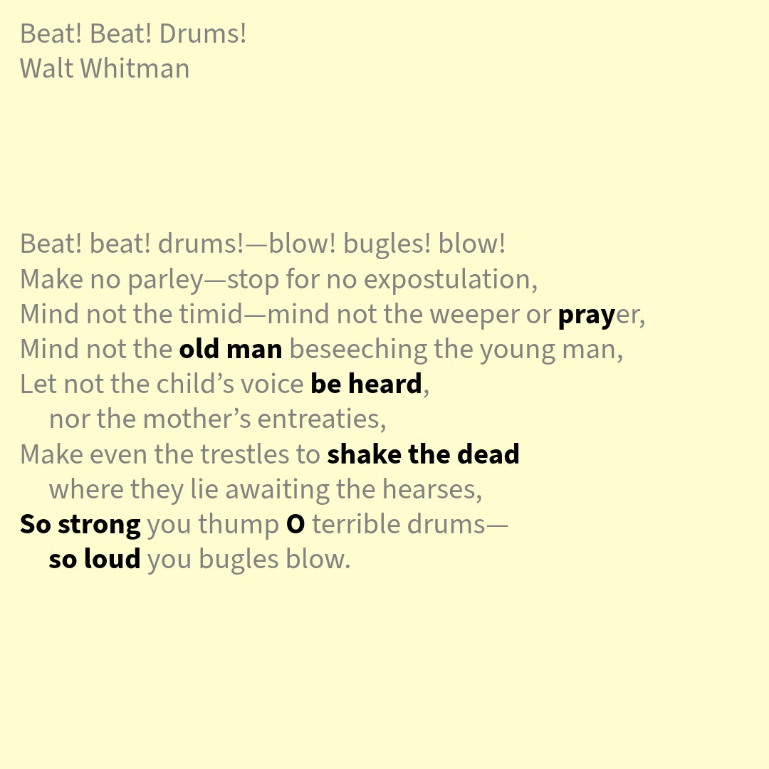 I’m getting pissed at poets. Whitman wrote this poem in 1861 after the battle of Bull Run, in which a Confederate victory showed the Union that, unsurprisingly, that the war would not be short, nor easy. A lesson the United States continues to never learn.