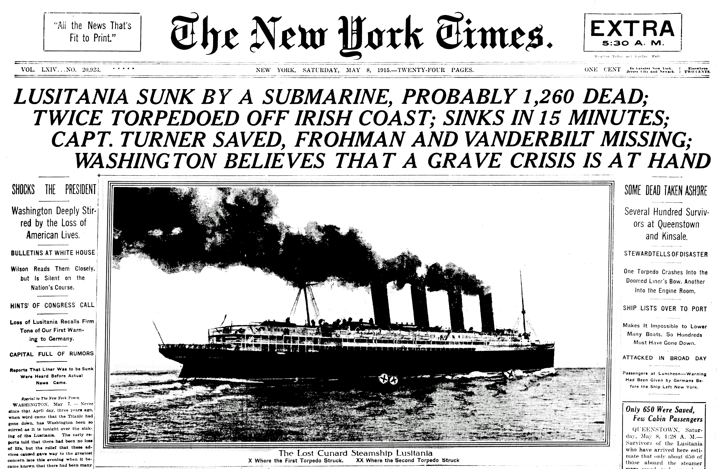On 7 May, 1915, she was sunk by the German U-boat U-20. Over 1,200 civilians died in the sea off the coast of Ireland. The next day, The New York Times runs this on the front page:
