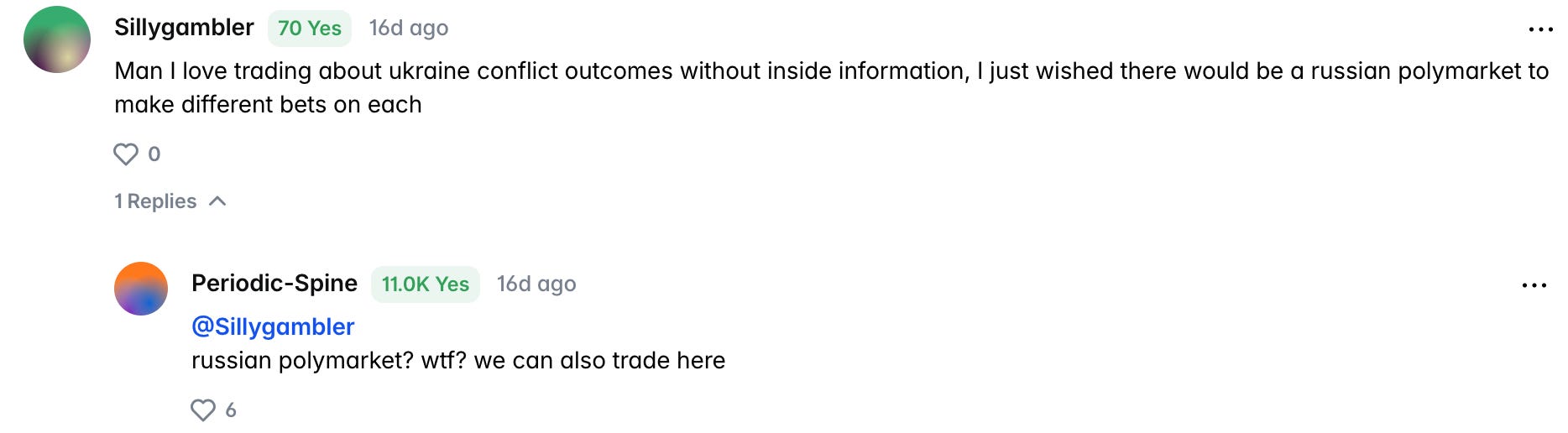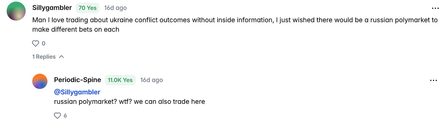 This is the current polymarket bet on the Russia vs. Ukraine Ceasefire. There are over 18 millions dollars in trading volume in the March 31, 2026 bet alone.